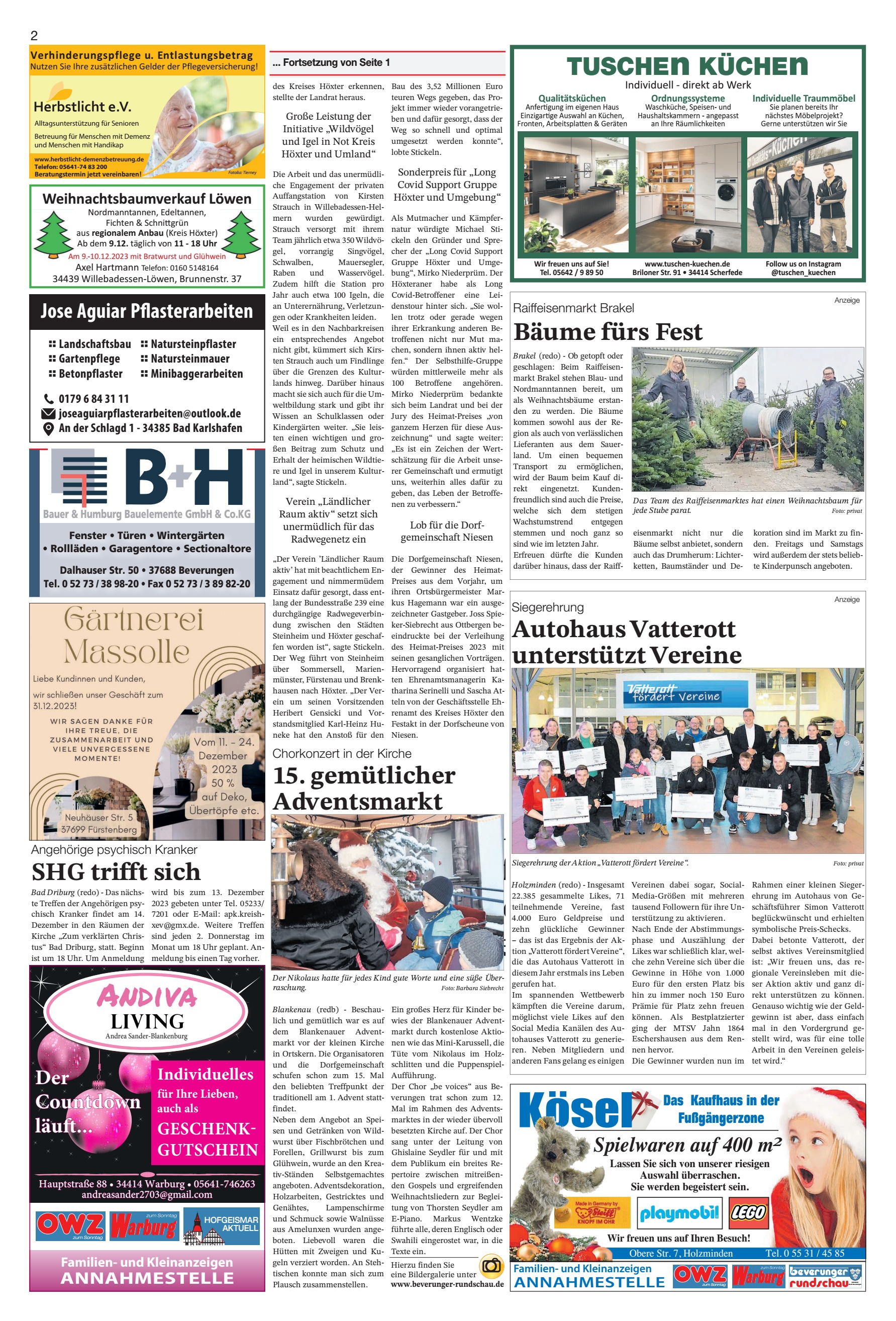 2 Hierzu finden Sie eine Bildergalerie unter www.beverunger-rundschau.de Foto Kommentar Film des Kreises Höxter erkennen, stellte der Landrat heraus. Große Leistung der Initiative Wildvögel und Igel in Not Kreis Höxter und Umland Die Arbeit und das unermüdli- che Engagement der privaten Auffangstation von Kirsten Strauch in Willebadessen-Hel- mern wurden gewürdigt. Strauch versorgt mit ihrem Team jährlich etwa 350Wildvö- gel, vorrangig Singvögel, Schwalben, Mauersegler, Raben und Wasservögel. Zudem hilft die Station pro Jahr auch etwa 100 Igeln, die an Unterernährung, Verletzun- gen oder Krankheiten leiden. Weil es in den Nachbarkreisen ein entsprechendes Angebot nicht gibt, kümmert sich Kirs- ten Strauch auch um Findlinge über die Grenzen des Kultur- lands hinweg. Darüber hinaus macht sie sich auch für die Um- weltbildung stark und gibt ihr Wissen an Schulklassen oder Kindergärten weiter. Sie leis- ten einen wichtigen und gro- ßen Beitrag zum Schutz und Erhalt der heimischen Wildtie- re und Igel in unserem Kultur- land, sagte Stickeln. Verein Ländlicher Raum aktiv setzt sich unermüdlich für das Radwegenetz ein Der Verein Ländlicher Raum aktiv hat mit beachtlichem En- gagement und nimmermüdem Einsatz dafür gesorgt, dass ent- lang der Bundesstraße 239 eine durchgängige Radwegeverbin- dung zwischen den Städten Steinheim und Höxter geschaf- fen worden ist, sagte Stickeln. Der Weg führt von Steinheim über Sommersell, Marien- münster, Fürstenau und Brenk- hausen nach Höxter. Der Ver- ein um seinen Vorsitzenden Heribert Gensicki und Vor- standsmitglied Karl-Heinz Hu- neke hat den Anstoß für den Bau des 3,52 Millionen Euro teuren Wegs gegeben, das Pro- jekt immer wieder vorangetrie- ben und dafür gesorgt, dass der Weg so schnell und optimal umgesetzt werden konnte, lobte Stickeln. Sonderpreis für Long Covid Support Gruppe Höxter und Umgebung Als Mutmacher und Kämpfer- natur würdigte Michael Sti- ckeln den Gründer und Spre- cher der Long Covid Support Gruppe Höxter und Umge- bung, Mirko Niederprüm. Der Höxteraner habe als Long Covid-Betroffener eine Lei- denstour hinter sich. Sie wol- len trotz oder gerade wegen ihrer Erkrankung anderen Be- troffenen nicht nur Mut ma- chen, sondern ihnen aktiv hel- fen. Der Selbsthilfe-Gruppe würden mittlerweile mehr als 100 Betroffene angehören. Mirko Niederprüm bedankte sich beim Landrat und bei der Jury des Heimat-Preises von ganzem Herzen für diese Aus- zeichnung und sagte weiter: Es ist ein Zeichen der Wert- schätzung für die Arbeit unse- rer Gemeinschaft und ermutigt uns, weiterhin alles dafür zu geben, das Leben der Betroffe- nen zu verbessern. Lob für die Dorf- gemeinschaft Niesen Die Dorfgemeinschaft Niesen, der Gewinner des Heimat- Preises aus dem Vorjahr, um ihren Ortsbürgermeister Mar- kus Hagemann war ein ausge- zeichneter Gastgeber. Joss Spie- ker-Siebrecht aus Ottbergen be- eindruckte bei der Verleihung des Heimat-Preises 2023 mit seinen gesanglichen Vorträgen. Hervorragend organisiert hat- ten Ehrenamtsmanagerin Ka- tharina Serinelli und Sascha At- teln von der Geschäftsstelle Eh- renamt des Kreises Höxter den Festakt in der Dorfscheune von Niesen. ... Fortsetzung von Seite 1 Chorkonzert in der Kirche 15. gemütlicher Adventsmarkt Blankenau (redb) - Beschau- lich und gemütlich war es auf dem Blankenauer Advent- markt vor der kleinen Kirche in Ortskern. Die Organisatoren und die Dorfgemeinschaft schufen schon zum 15. Mal den beliebten Treffpunkt der traditionell am 1. Advent statt- findet. Neben dem Angebot an Spei- sen und Getränken von Wild- wurst über Fischbrötchen und Forellen, Grillwurst bis zum Glühwein, wurde an den Krea- tiv-Ständen Selbstgemachtes angeboten. Adventsdekoration, Holzarbeiten, Gestricktes und Genähtes, Lampenschirme und Schmuck sowie Walnüsse aus Amelunxen wurden ange- boten. Liebevoll waren die Hütten mit Zweigen und Ku- geln verziert worden. An Steh- tischen konnte man sich zum Plausch zusammenstellen. Hierzu finden Sie eine Bildergalerie unter www.beverunger-rundschau.de Foto Ein großes Herz für Kinder be- wies der Blankenauer Advent- markt durch kostenlose Aktio- nen wie das Mini-Karussell, die Tüte vom Nikolaus im Holz- schlitten und die Puppenspiel- Aufführung. Der Chor be voices aus Be- verungen trat schon zum 12. Mal im Rahmen des Advents- marktes in der wieder übervoll besetzten Kirche auf. Der Chor sang unter der Leitung von Ghislaine Seydler für und mit dem Publikum ein breites Re- pertoire zwischen mitreißen- den Gospels und ergreifenden Weihnachtsliedern zur Beglei- tung von Thorsten Seydler am E-Piano. Markus Wentzke führte alle, deren Englisch oder Swahili eingerostet war, in die Texte ein. Der Nikolaus hatte für jedes Kind gute Worte und eine süße Über- raschung. Foto: Barbara Siebrecht Angehörige psychisch Kranker SHG trifft sich Bad Driburg (redo) - Das nächs- te Treffen der Angehörigen psy- chisch Kranker findet am 14. Dezember in den Räumen der Kirche Zum verklärten Chris- tus Bad Driburg, statt. Beginn ist um 18 Uhr. Um Anmeldung wird bis zum 13. Dezember 2023 gebeten unter Tel. 05233/ 7201 oder E-Mail: apk.kreish- xevgmx.de. Weitere Treffen sind jeden 2. Donnerstag im Monat um 18 Uhr geplant. An- meldung bis einen Tag vorher. Siegerehrung Autohaus Vatterott unterstützt Vereine Holzminden (redo) - Insgesamt 22.385 gesammelte Likes, 71 teilnehmende Vereine, fast 4.000 Euro Geldpreise und zehn glückliche Gewinner das ist das Ergebnis der Ak- tion Vatterott fördert Vereine, die das Autohaus Vatterott in diesem Jahr erstmals ins Leben gerufen hat. Im spannenden Wettbewerb kämpften die Vereine darum, möglichst viele Likes auf den Social Media Kanälen des Au- tohauses Vatterott zu generie- ren. Neben Mitgliedern und anderen Fans gelang es einigen Vereinen dabei sogar, Social- Media-Größen mit mehreren tausend Followern für ihre Un- terstützung zu aktivieren. Nach Ende der Abstimmungs- phase und Auszählung der Likes war 