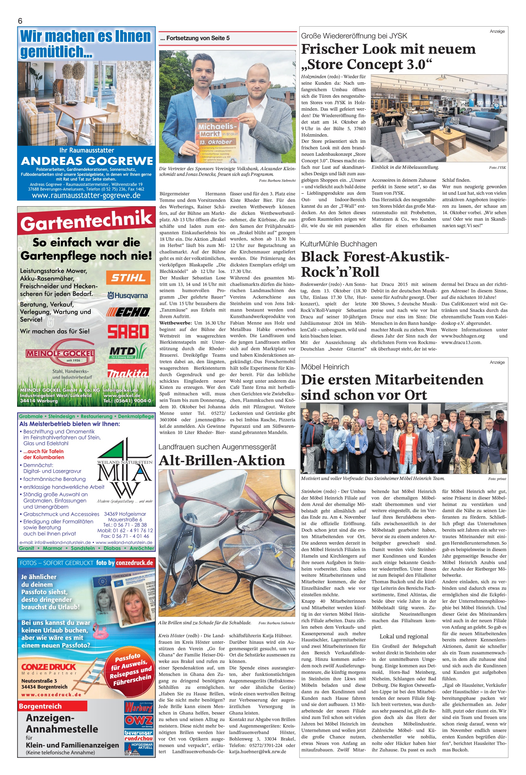 6 Bürgermeister Hermann Temme und dem Vorsitzenden des Werberings, Rainer Schä- fers, auf der Bühne am Markt- platz. Ab 13 Uhr öffnen die Ge- schäfte und laden zum ent- spannten Einkaufserlebnis bis 18 Uhr ein. Die Aktion Brakel im Herbst läuft bis zum Mi- chaelismarkt. Auf der Bühne geht es mit der volkstümlichen, vierköpfigen Blaskapelle Die Blechknödel ab 12 Uhr los. Der Musiker Sebastian Lose tritt um 13, 14 und 16 Uhr mit seinem humorvollen Pro- gramm Der gelehrte Bauer auf. Um 15 Uhr bezaubern die Tanzmäuse aus Erkeln mit ihrem Auftritt. Wettbewerbe: Um 16.30 Uhr beginnt auf der Bühne der Wettstreit im waagerechten Bierkistenstapeln mit Unter- stützung durch die Rheder- Brauerei. Dreiköpfige Teams treten dabei an, den längsten, waagerechten Bierkistenturm durch Gegendruck und ge- schicktes Eingliedern neuer Kisten zu erzeugen. Wer den Spaß mitmachen will, muss sein Team bis zum Donnerstag, dem 10. Oktober bei Johanna Menne unter Tel. 05272/ 3601004 oder j.menneBra- kel.de anmelden. Als Gewinne winken 10 Liter Rheder- Bier- fässer und für den 3. Platz eine Kiste Rheder Bier. Für den zweiten Wettbewerb können die dicken Wettbewerbsteil- nehmer, die Kürbisse, die aus den Samen der Frühjahrsakti- on Brakel blüht auf gezogen wurden, schon ab 11.30 bis 12 Uhr zur Begutachtung an die Kirchenmauer angeliefert werden. Die Prämierung des dicksten Exemplars erfolgt um 17.30 Uhr. Während des gesamten Mi- chaelismarkts dürfen die histo- rischen Landmaschinen des Vereins Ackerschiene aus Steinheim und von Jens Ink- mann bestaunt werden und Kunsthandwerksprodukte von Fabian Menne aus Holz und Metallbau Habke erworben werden. Die Landfrauen und die jungen Landfrauen stellen sich auf dem Marktplatz vor und haben Kinderaktionen an- gekündigt.-Das Forschermobil hält tolle Experimente für Kin- der bereit. Für das leibliche Wohl sorgt unter anderem das Café Tante Erna mit herbstli- chen Gerichten wie Zwiebelku- chen, Flammkuchen und Knö- deln mit Pilzragout. Weitere Leckereien und Getränke gibt es bei Imbiss Rasche, Pizzeria Paparazzi und am Süßwaren- stand gebrannten Mandeln. ... Fortsetzung von Seite 5 Die Vertreter des Sponsors Vereinigte Volksbank, Alexander Klein- schmidt und Jonas Denecke, freuen sich aufs Programm. Foto: Barbara Siebrecht KulturMühle Buchhagen Black Forest-Akustik- RocknRoll Bodenwerder (redo) - Am Sonn- tag, dem 13. Oktober (18.30 Uhr, Einlass 17.30 Uhr, Hut- konzert), spielt der letzte RocknRoll-Vampir Sebastian Dracu auf seiner 10-jährigen Jubiläumstour 2024 im Müh- lenCafé unbeugsam, wild und kein bisschen leiser. Mit der Auszeichnung als Deutschlan bester Gitarrist hat Dracu 2015 mit seinem Debüt in der deutschen Musik- szene für Aufruhr gesorgt. Über 300 Shows, 5 deutsche Musik- preise und nach wie vor hat Dracu nur eins im Sinn: Die Menschen in den Bann handge- machter Musik zu ziehen. Wem dieses Jahr der Sinn nach der ehrlichsten Form von Rockmu- sik überhaupt steht, der ist wie- dermal bei Dracu an der richti- gen Adresse! In diesem Sinne, auf die nächsten 10 Jahre! Das CaféKonzert wird mit Ge- tränken und Snacks durch das ehrenamtliche Team von Kalei- doskop e.V. abgerundet. Weitere Informationen unter www.buchhagen.org und www.dracu13.com. Landfrauen suchen Augenmessgerät Alt-Brillen-Aktion Kreis Höxter (redb) - Die Land- frauen im Kreis Höxter unter- stützen den Verein Go for Ghana der Familie Heiser-Dü- weke aus Brakel und rufen zu einer Spendenaktion auf, um Menschen in Ghana den Zu- gang zu dringend benötigten Sehhilfen zu ermöglichen. Haben Sie zu Hause Brillen, die Sie nicht mehr benötigen? Jede Brille kann einem Men- schen in Ghana helfen, besser zu sehen und seinen Alltag zu meistern. Diese nicht mehr be- nötigten Brillen werden hier vor Ort von Optikern ausge- messen und verpackt, erläu- tert Landfrauenverbands-Ge- schäftsführerin Katja Hübner. Darüber hinaus wird ein Au- genmessgerät gesucht, um vor Ort die Sehstärke ausmessen zu können. Die Spende eines ausrangier- ten, aber funktionstüchtigen Augenmessgeräts (Refraktome- ter oder ähnliche Geräte) würde einen wertvollen Beitrag zur Verbesserung der augen- ärztlichen Versorgung in Ghana leisten. Kontakt zur Abgabe von Brillen und Augenmessgeräten: Kreis- landfrauenverband Höxter, Bohlenweg 3, 33034 Brakel, Telefon: 05272/3701-224 oder katja.huebnerlwk.nrw.de Alte Brillen sind zu Schade für die Schublade. Foto: Barbara Siebrecht Je ähnlicher du deinem Passfoto siehst, desto dringender brauchst du Urlaub! Bei uns kannst du zwar keinen Urlaub buchen, aber wie wäre es mit einem neuen Passfoto? Neutorstraße 3 34434 Borgentreich www . c o n z e d r u c k . d e foto by conzedruck.de FOTOS SOFORT GEDRUCKT Passfo to für Aus weis, Reisep ass un d Führer schein Borgentreich Anzeigen- Annahmestelle für Klein- und Familienanzeigen (Keine telefonische Annahme) zum Sonntag HOFGEISMAR AKTUELL Polsterarbeiten, Gardinendekorationen, Sonnenschutz, Fußbodenarbeiten sind unsere Spezialgebiete, in denen wir Ihnen gerne mit Rat und Tat zur Seite stehen. Andreas Gogrewe - Raumausstattermeister, Wöhrenstraße 19 37688 Beverungen-Amelunxen, Telefon (0 52 75) 236, Fax 1462 www.raumausstatter-gogrewe.de Wir machen es Ihnen gemütlich... ANDREAS GOGREWE Ihr Raumausstatter Gartentechnik So einfach war die Gartenpflege noch nie! Leistungsstarke Mower, Akku-Rasenmäher, Freischneider und Hecken- scheren für jeden Bedarf. MEINOLF GOCKEL GmbH & Co. KG Industriegebiet West/Lütkefeld 34414 Warburg infogockel.de www.gockel.de Tel.: (05641) 9004-0 Beratung, Verkauf, Verlegung, Wartung und Service! Wir machen das für Sie! Grabmale Steindesign Restaurierung Denkmalpflege Als Meisterbetrieb bieten wir Ihnen: Beschriftung und Ornamentik im Feinstrahlverfahren auf Stein, Glas und Edelstahl ...auch für Tafeln der Kolumbarien Demnächst: Digital- und Lasergravur fachmännische Beratung erstklassige handwerkliche Arbeit Ständig große Auswahl an Grabmalen, Einfassungen